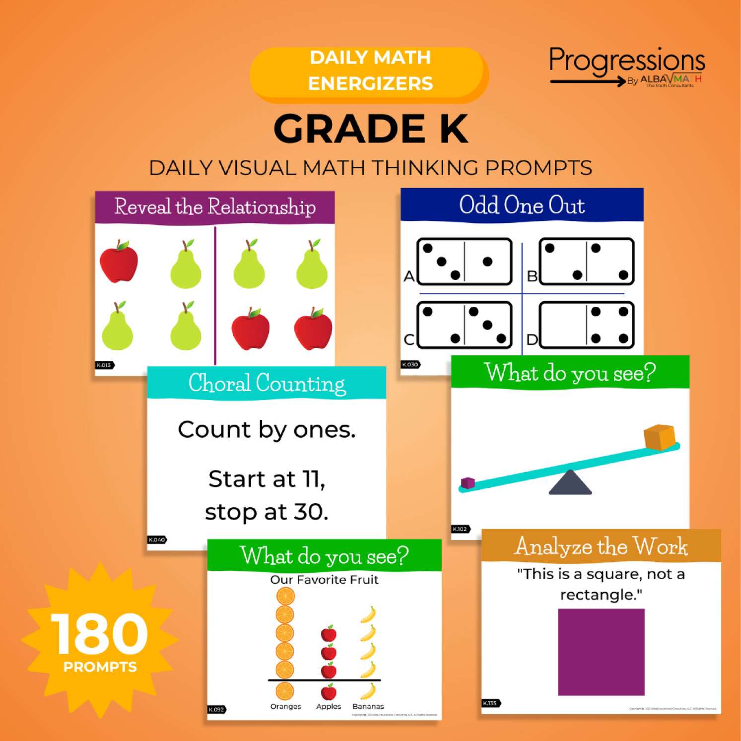 180 visual daily prompts to encourage creative math thinking and reinforce concepts through spaced retrieval.