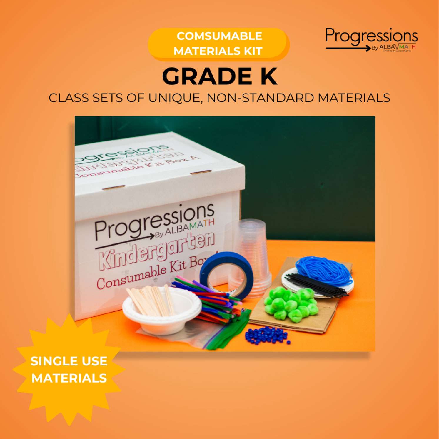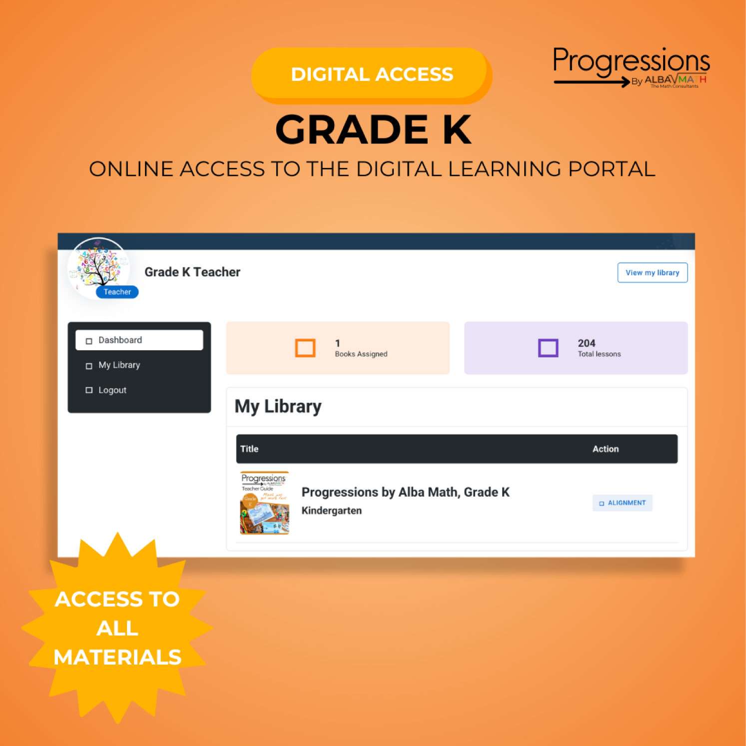 One year online access to the Progressions by Alba Math Grade K Portal