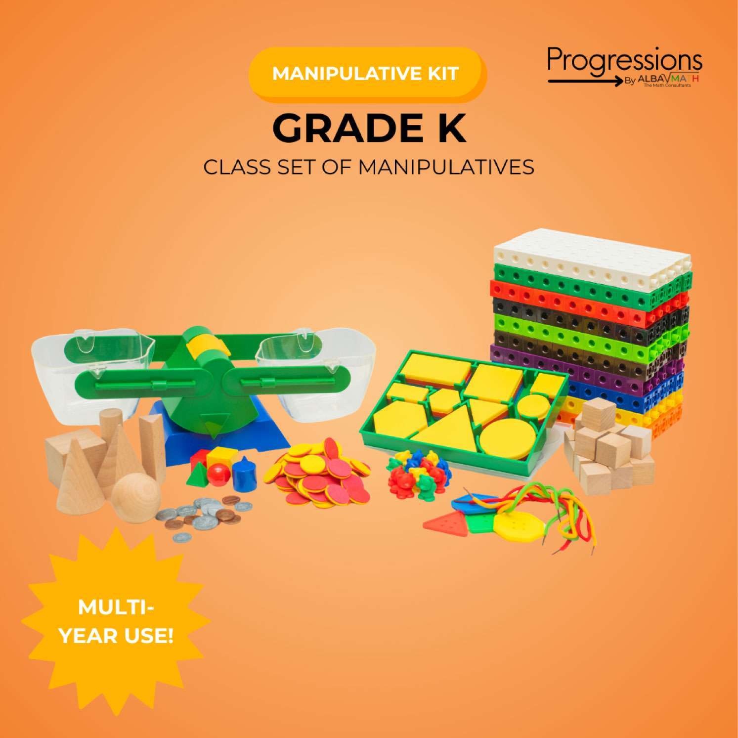 A class set of all manipulatives needed for each student to explore math concepts simultaneously, and intended for multi-year use.