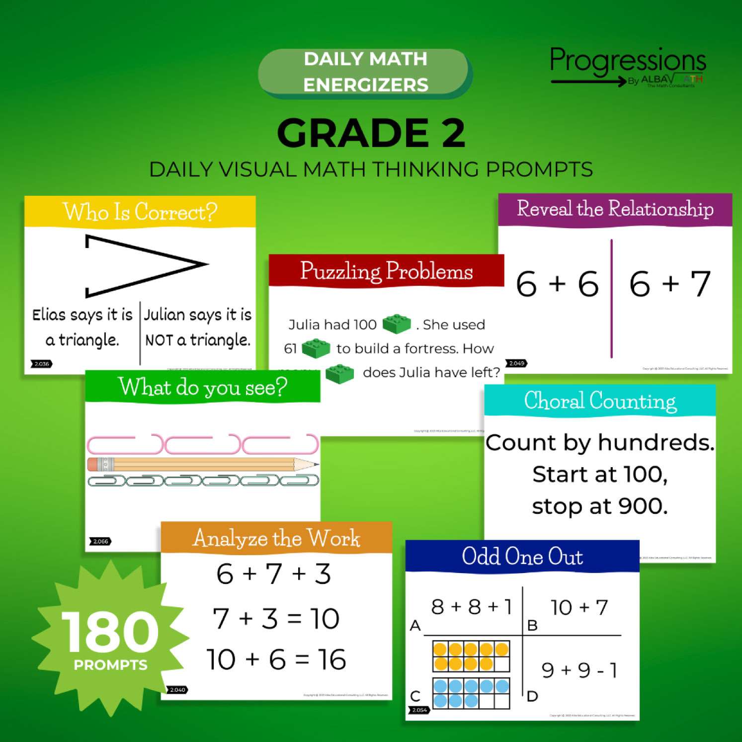 180 visual daily prompts to encourage creative math thinking and reinforce concepts through spaced retrieval.