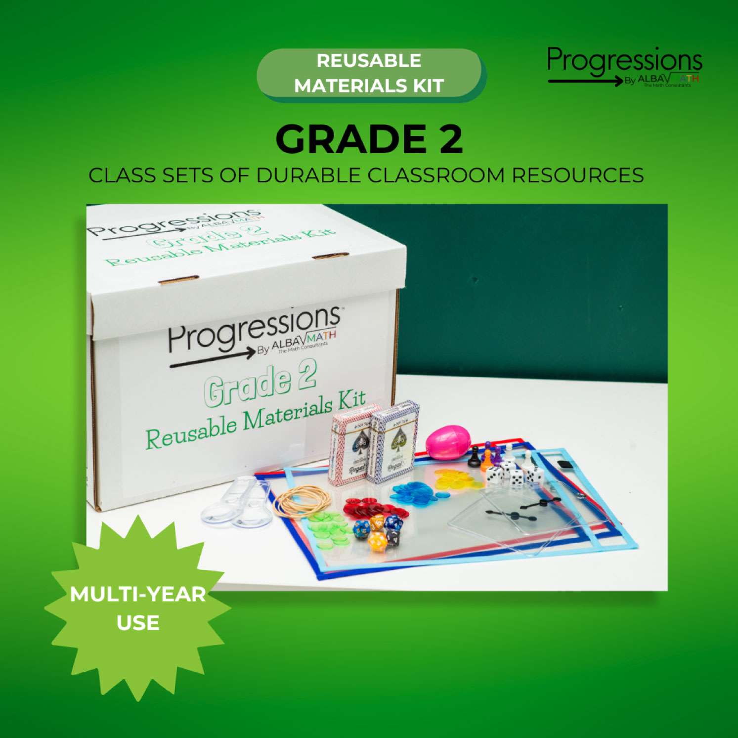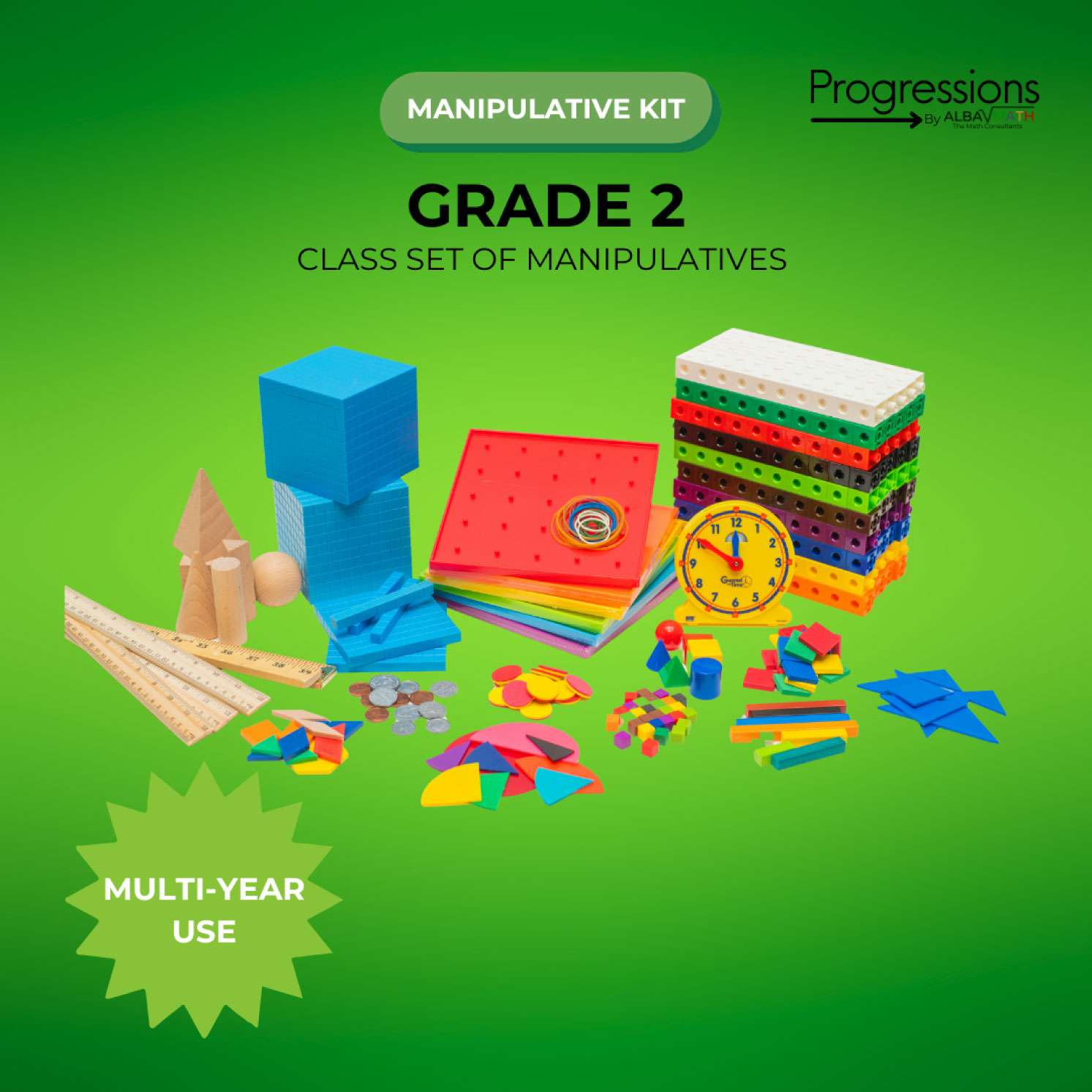A class set of all manipulatives needed for each student to explore math concepts simultaneously, and intended for multi-year use.
